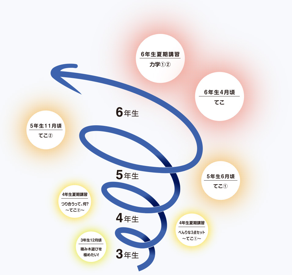 公式サイトより:らせん状(スパイラル)カリキュラムの例 (理科「てこ」3〜6年)